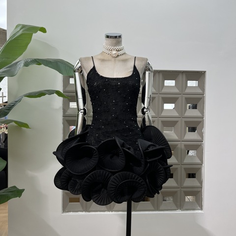 Boetiek Damesjurk 2025 Herfst/Winter Nieuw Product Bloem Hot Diamond Perspectief Gesplitste Bandjurk