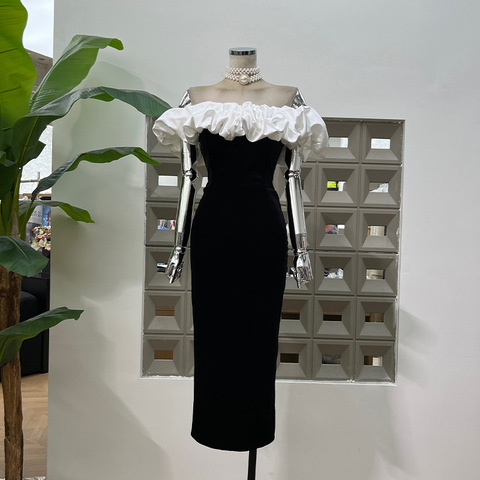 Banket Verjaardagsavondjurk Zwart Één Woord Kraag Ruche Rand Off Shoulder Afslankende Wikkel Heup Fluwelen Jurk
